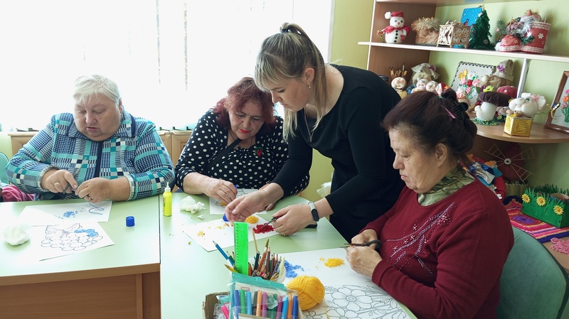 В отделении дневного пребывания ГБУ КЦСОН Краснобаковского муниципального округа специалисты Краснобаковской библиотеки провели мастер – класс «Аппликация из мелко нарезанных шерстяных нитей».