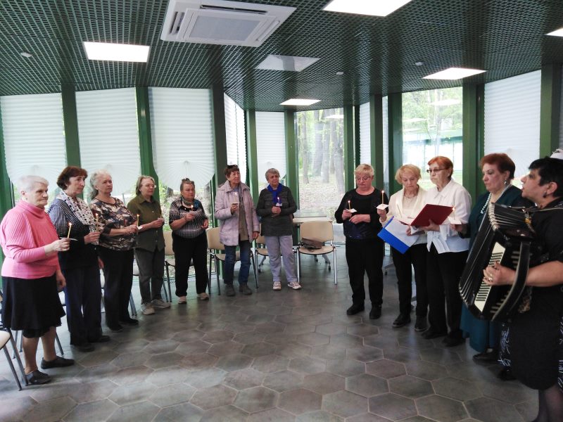 Сотрудники отделения дневного пребывания провели мероприятия в парке Швейцария. Перед зрителями выступил ансамбль хора нашего учреждения «Ильинская слобода» под руководством Маргариты Наливайко. В концертной программе «Майскими короткими ночами..» прозвучали песни военных лет. В память о погибших воинах была зажжена «Свеча памяти» и исполнена песня «Помолимся за родителей». Мелодии военных лет близки каждому человеку, особенно если он родился и вырос в СССР. У многих из них война унесла самых близких и родных людей. Зрители слушали и подпевали знакомые песни со слезами на глазах.